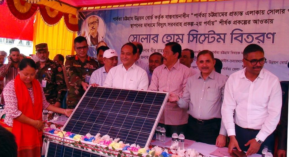 আজ বৃহস্পতিবার রাঙ্গামাটি জেলার কাপ্তাই উপজেলাধীন ওয়াগ্গা ইউনিয়নের সাক্রাছড়ি উচ্চ বিদ্যালয় প্রাঙ্গনে দুর্গম এলাকার দুই ইউনিয়নের ১১৫ সুবিধাভোগী পরিবারের মাঝে সম্পূর্ণ বিনামূল্যে সোলার হোম প্যানেল এর মাধ্যমি বিদ্যুৎ বিতরণ অনুষ্ঠানে প্রধান অতিথির বক্তব্যে পার্বত্য মন্ত্রী বীর বাহাদুর এসব কথা বলেন।