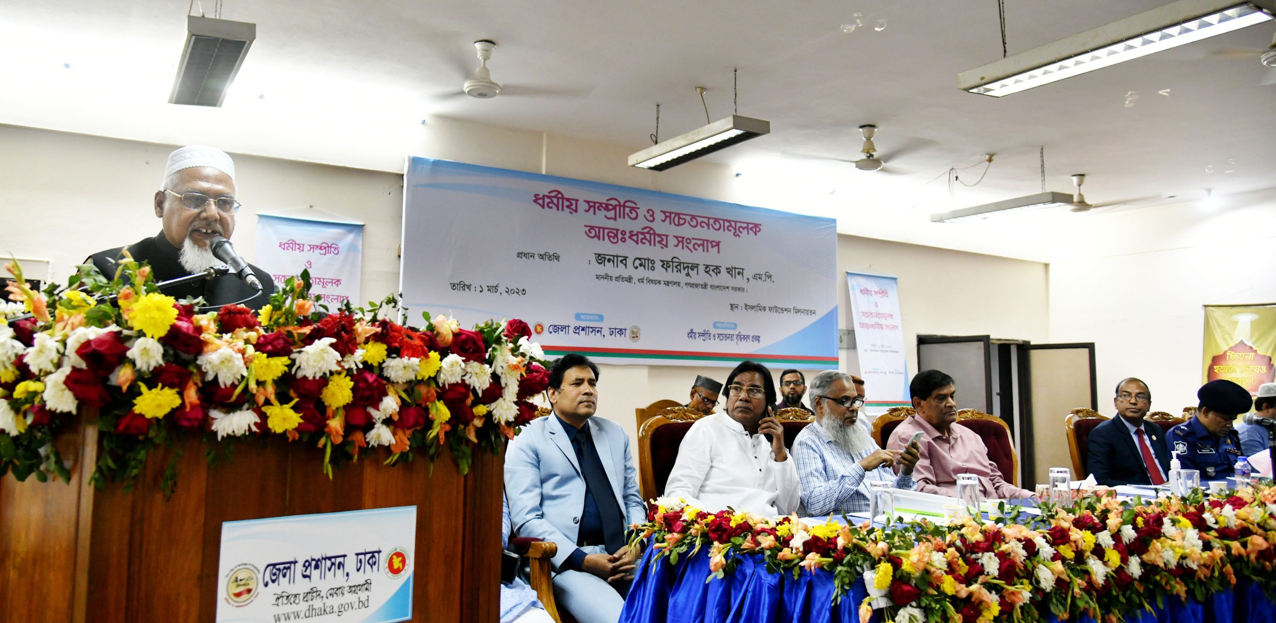 প্রতিমন্ত্রী বুধবার ঢকায় ইসলামিক ফাউণ্ডেশন মিলনায়তনে ঢাকা জেলা প্রশাসন এর আয়োজনে ও ধর্ম বিষয়ক মন্ত্রণালয় পরিচালিত “ধর্মীয় সম্প্রীতি ও সচেতনতা বৃদ্ধিকরণ” প্রকল্পের সহযোগিতায় অনুষ্ঠিত ধর্মীয় সম্প্রীতি ও সচেতনতা মূলক আন্তঃধর্মীয় সংলাপ অনুষ্ঠানে প্রধান অতিথির বক্তৃতায় এসব কথা বলেন।